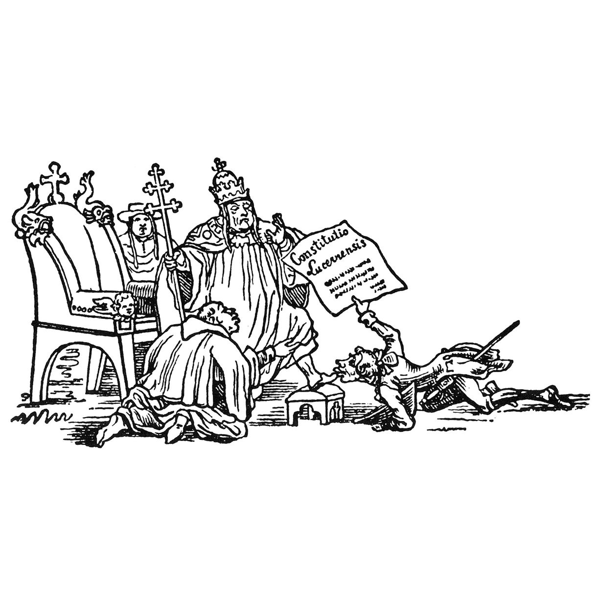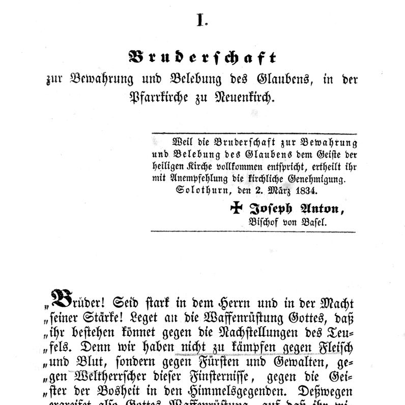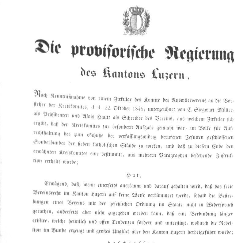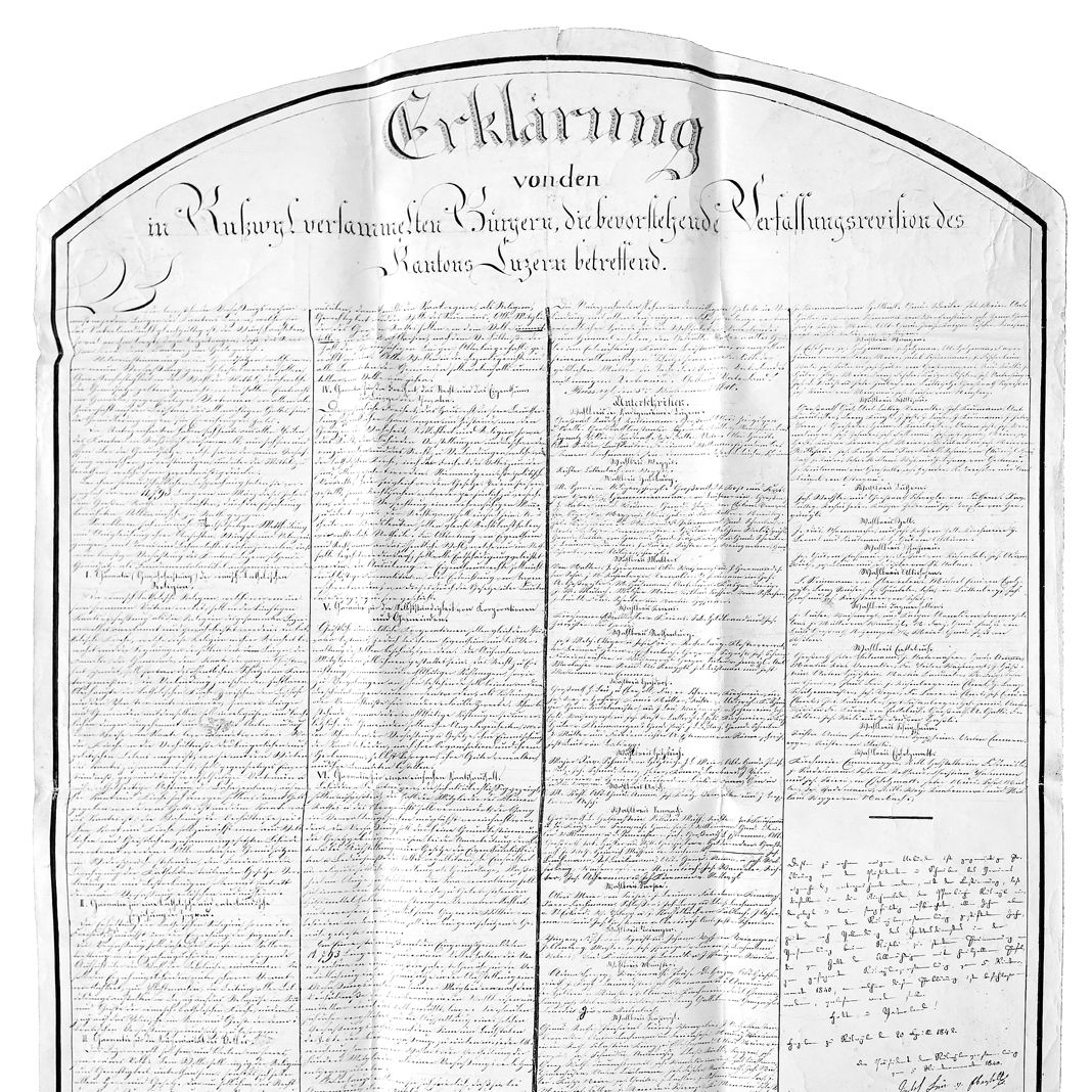 1832 verurteilt Papst Gregor XVI. in einer Enzyklika die moderne Kultur und Wissenschaft sowie die liberale Denkweise. Während sich die Bischöfe in der Schweiz den Weisungen des Papstes fügen, antworten Liberale Abgeordnete aus den Kantonen Bern, Luzern, Solothurn, Baselland, Aargau, Thurgau und St. Gallen auf Anregung des Luzerners Eduard Pfyffer (im Bild rechts) und des St. Gallers Jakob Gallus Baumgartner mit den so genannten Badener Artikeln. Sie verlangen die Schaffung eines Schweizer Erzbistums, die Einführung von Kirchensynoden, das Recht des Staates, kirchliche Erlasse zu genehmigen oder abzulehnen, die Zulassung konfessionell gemischter Ehen, eine Beschränkung der arbeitsfreien Festtage, kantonale Aufsicht über die Priesterseminare und Ordensgeistliche sowie die Besteuerung der Klöster. Die Badener Artikel werden im liberal dominierten Luzerner Parlament gutgeheissen und werden nun zum grossen Zankapfel zwischen Liberalen und Konservativen. Gegen die Badener Artikel wendet sich auch die hier im „Rössli“ verfasste Ruswiler Erklärung. Als 1841 die Katholisch-Konservativen an die Macht kommen, werden die Badener Artikel im Kanton Luzern aufgehoben.